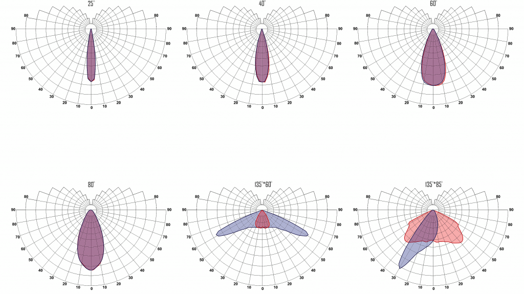 Угол излучения, в поперечной/продольной плоскости 25°/40°/60°/80°/135°*60°/135°*85°